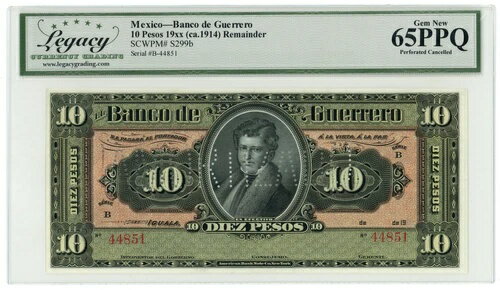 19XX Banco de Guerrero Iguala Mexico 10 Pesos Legacy UNC 65PPQ S299b (64346)商品について19XX年 (1914年頃)種類:紙幣グレード:65流通/非流通:非流通認証:旧通貨グレーディンググレード指定:EPQ/PPQ国:...