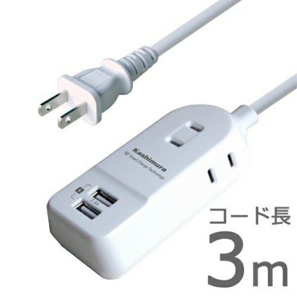 カシムラ AC充電器タップ 3m 2.4A IC USB2P AC3P WH 急速充電 USB自動識別IC搭載 3口電源 ホワイト AJ-590