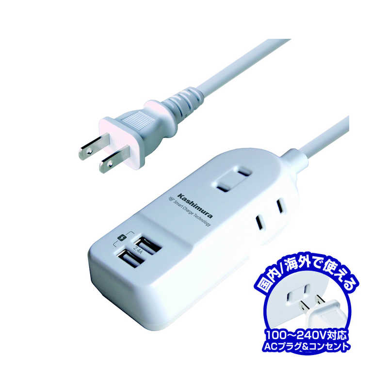 カシムラ AC充電器タップ 1m 2.4A IC USB2P AC3P WH 急速充電 USB自動識別IC搭載 3口電源 ホワイト AJ-588