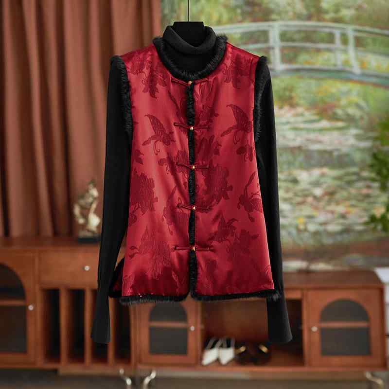 ベスト レディース 高級感 提花 シルク サテン ミンクファー 新しいチャイナスタイル 中国風 ラウンドネ...