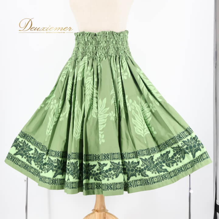 リラックスした雰囲気を演出する落ち着きのあるグリーンのフラダンス衣装、ハワイアンプリントで華やかさもプラス。ウエストゴム仕様で快適な着心地を実現。