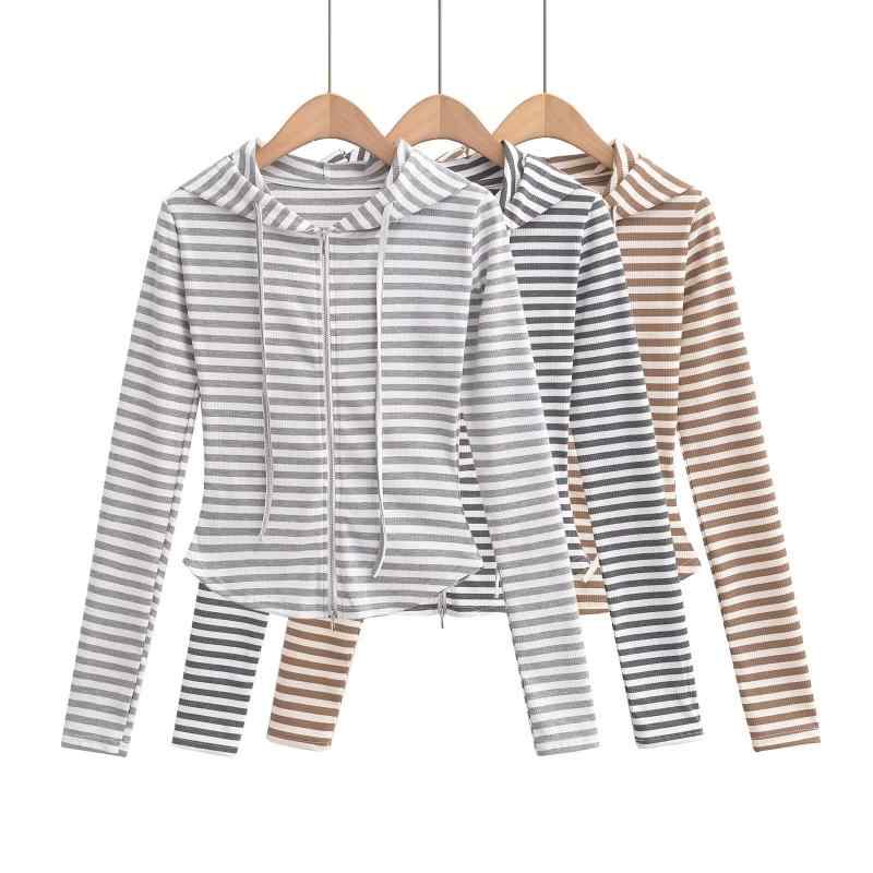 ニット レディース 秋冬 韓国風 ストライプ パーカー カーディガン トップス ショート丈 綿 混紡 普段使...