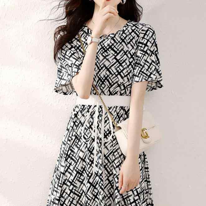 ・カテゴリ: ワンピース・スタイル: 通勤・主な素材: ポリエステル70-80%・柄: 幾何学模様・加工: パッチワーク・丈: ミディ丈・スカート丈: Aライン・ネックライン: クルーネック・袖丈: 半袖・ウエスト: ハイウ...