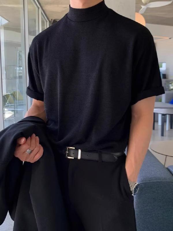 Tシャツ メンズ 半袖 レトロ風 ハーフハイネック トップス 薄手 ゆったり 接触冷感 吸湿速乾 ポリエステル 黒 白