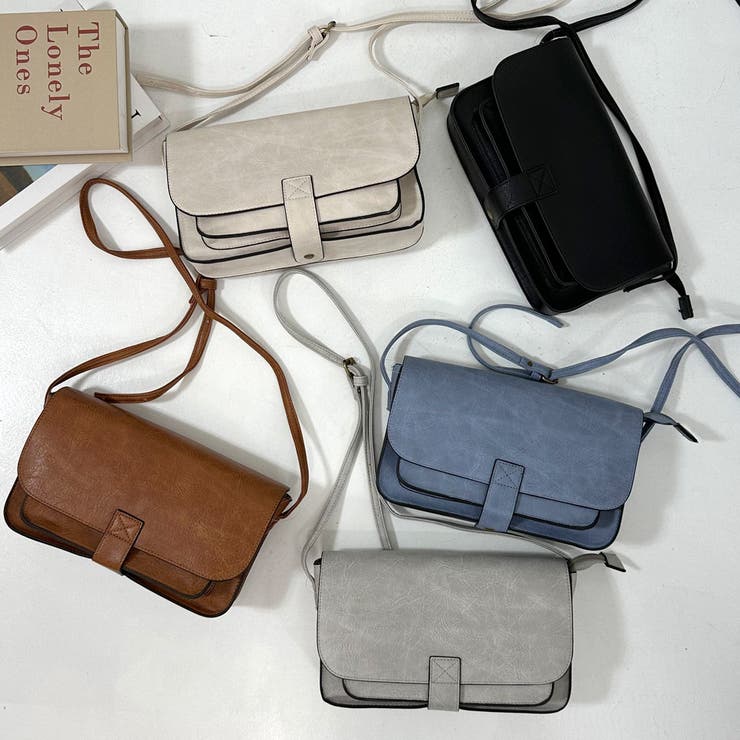 本革の様な質感のフェイクレザーかぶせショルダーバッグ。程良いサイズ感で軽量なのも嬉しいポイント。ショルダーベルトは長さ調節可能で、肩掛け、斜め掛けもOKです。マチもしっかりあるので見ため以上の収納力...