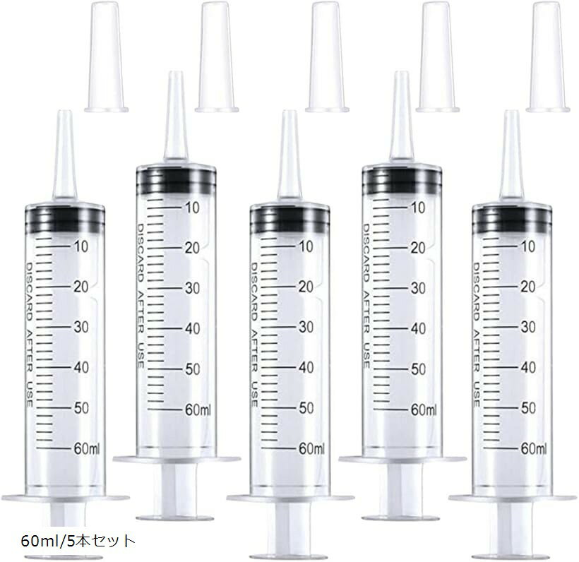 シリンジ 注射器 60ml ペット 流動食 給餌 給水用 犬 猫 小動物 注入器 針なし (クリア, 60ml/5本セット)