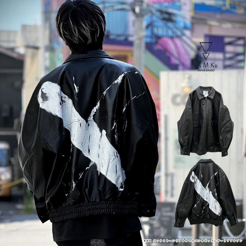KMK バック2トーンリアルクロスペンキビッグレザーリブブルゾン原宿 キングリーマスク KINGLYMASK メン...