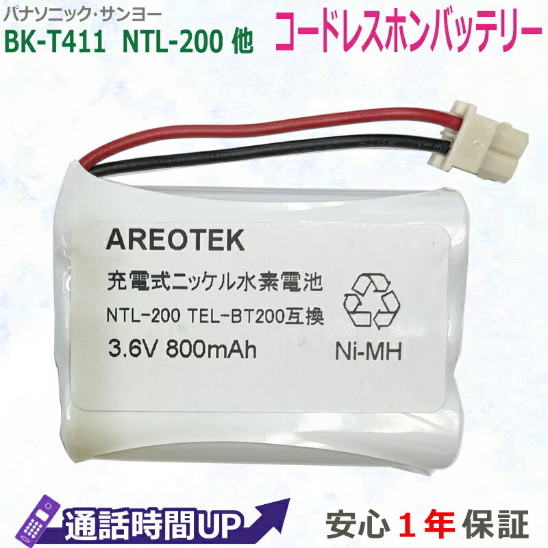【大容量】サンヨー対応 SANYO対応 NTL-200 TEL-BT200 BK-T411 対応 コードレスホン 子機 充電池 コード...