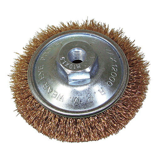 サイズ:外形85x穴径M10ネジ、ネジ径:M10xP1.5 金具径:60mm、毛丈:20mm 線種:鋼線メッキ(線径0.3mm) 最高使用回転数:12000min-1 材質:鋼線(真鍮メッキ)