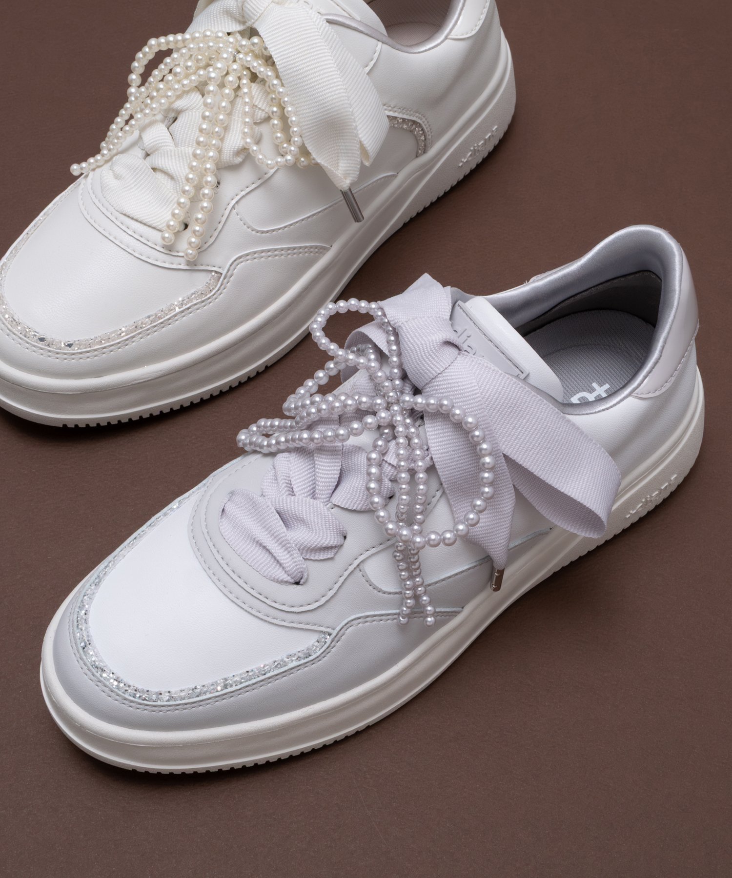 +diana(プラスダイアナ)【軽量】パールリボン付きコートスニーカー■デザインフェミニンさとスポーティの絶妙なバランスを叶えた軽量スニーカー。取り外し可能なパールリボンのシューアクセサリーと、上品なグロ...