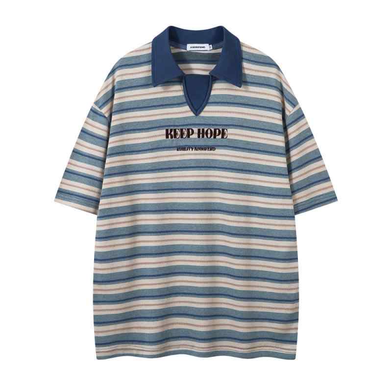 メンズ ポロシャツ 半袖 Tシャツ ポロ襟 ストライプ 英字 ロゴ 刺繍 切り替え 配色 ゆったり ビッグシル...