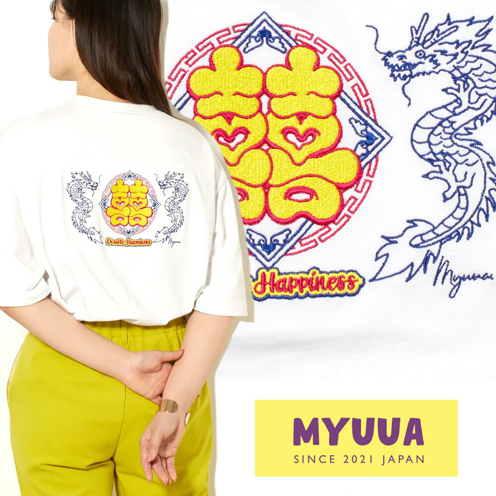 myuua 香港 ハピネス Tシャツ ホワイト 白 tシャツ 半袖 レディース 綿 コットン M L トップス カジュアル プレゼント ギフト 刺繍 かわいい ユーモア 個性的 おしゃれ 可愛い