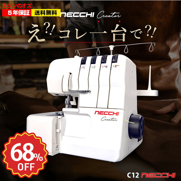 メーカー:NECCHI 型式:C12 フットコントローラー標準装備! ■ミシン機能: 1本針2本糸ロック、1本針2本糸飾り縫い、1本針3本糸ロック(幅が狭い)、1本針3本糸ロック(幅が広い)、2本針4本糸ロック、巻きロック、...