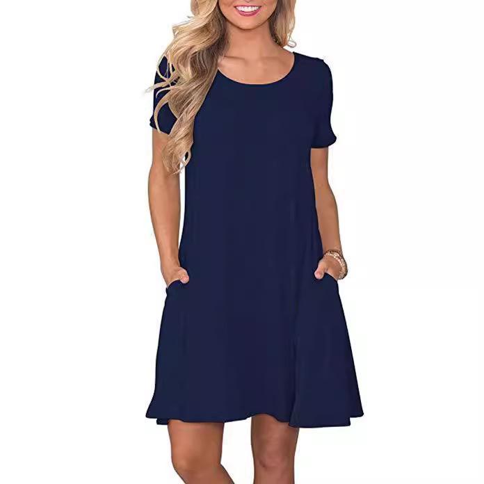 ワンピース レディース 丸首 無地 半袖 大 裾 Aライン ミディ丈 膝丈 綿混紡 切り替え 欧美風 カジュア...