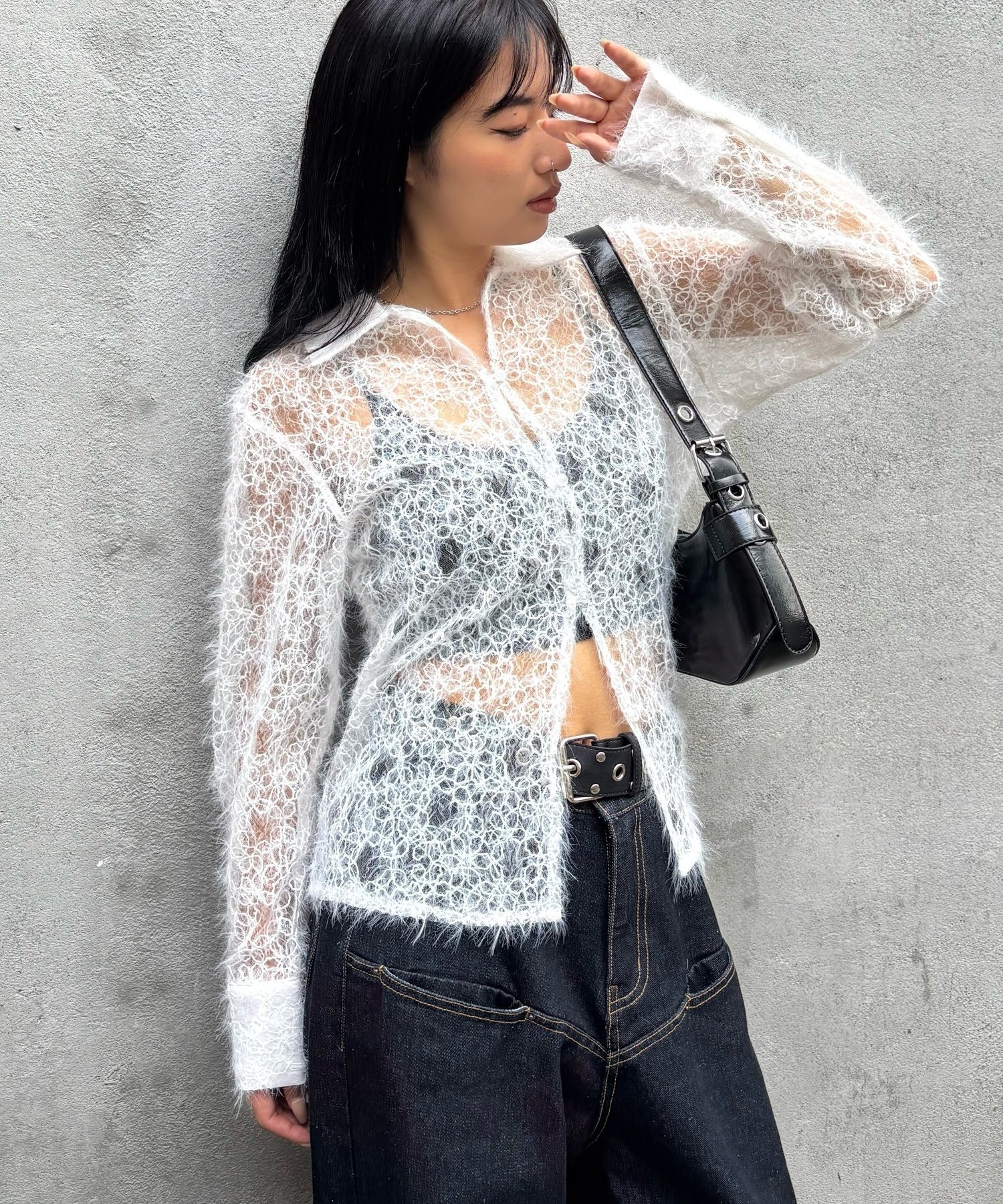 PAL GROUP OUTLET(パル グループ アウトレット)【WHO'S WHO gallery】フラワーレースニットシャツフラワーレースのデザインに透け感がポイントのニットシャツ■デザイン・シャツでもふわっとした素材に透け感が...