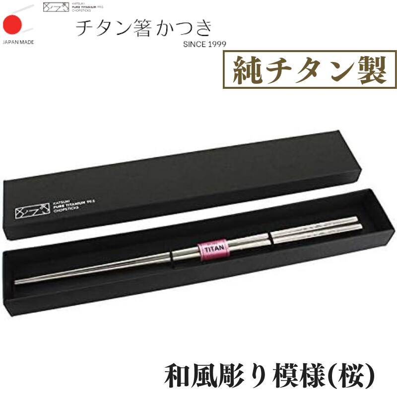 国産 チタン箸 和風彫り模様入りレーザー彫り 純チタン製 かつき箸 桜 さくら模様 極細 軽量 食洗機対応...