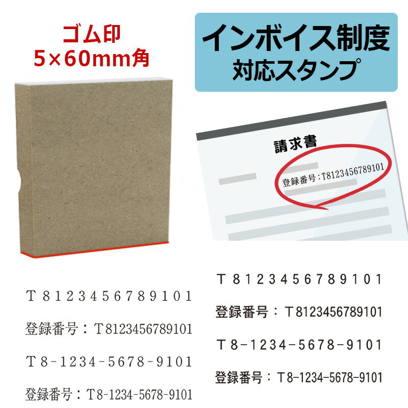 インボイス制度 対応スタンプ ゴム印 (印面サイズ:5×60mm) 特徴 5×60mm角のゴム印です。インボイス制度に伴い割り当てられた登録番号を領収書や納品書、請求書に押せ、事務作業に最適なゴム印です。 記入作業...