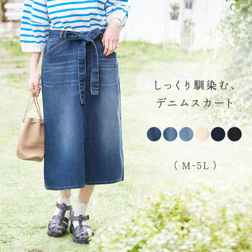 \早割全品10%OFFクーポン/スカート 膝丈 リボン付デニムスカート<M〜5L>(M〜5L) ベルーナ belluna ...