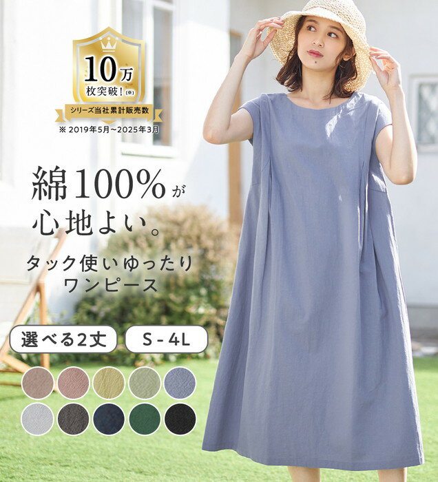 \早割全品10%OFFクーポン/レギュラー丈 ショート丈 ワンピース 【選べる2丈】綿100%タック使いワン...