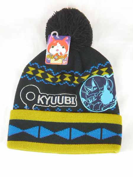 【妖怪ウォッチ】(キュウビ/黒×イエロー)★子供 ニット帽子/帽子(青ワッペン)