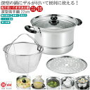両手鍋 深型 湯切りザル付き 22cm ガラス蓋付き ステンレス製深型両手鍋22cm 蒸し調理用目皿付き 家庭用...