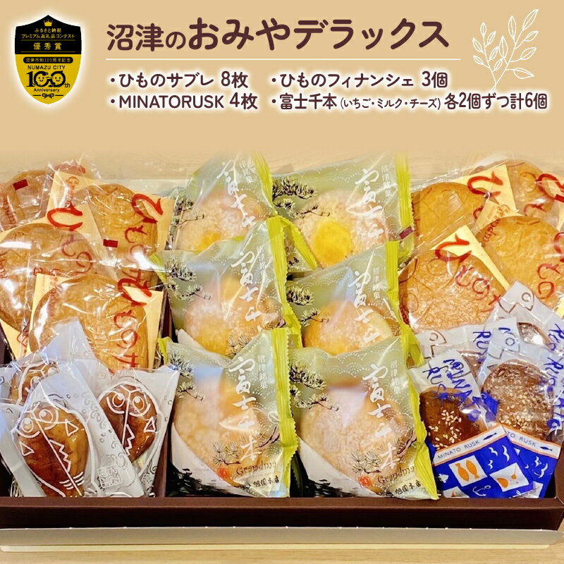 返礼品説明 名称 【ふるさと納税】沼津おみやデラックス 内容量 ・ブッセ【富士千本】(いちご・ミルク・チーズ)各2袋 計6個 ・ひものサブレ 8枚 ・MINATO RASUKU 4枚 ・ひものフィナンシェ 3個 最終加工地 沼津市...