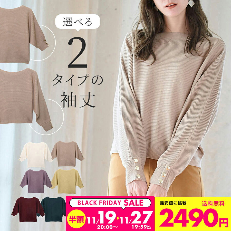 ドルマンニット【SALE】ニット レディース 秋冬 ドルマンスリーブ リブニット 袖ボタン ボートネック 七...