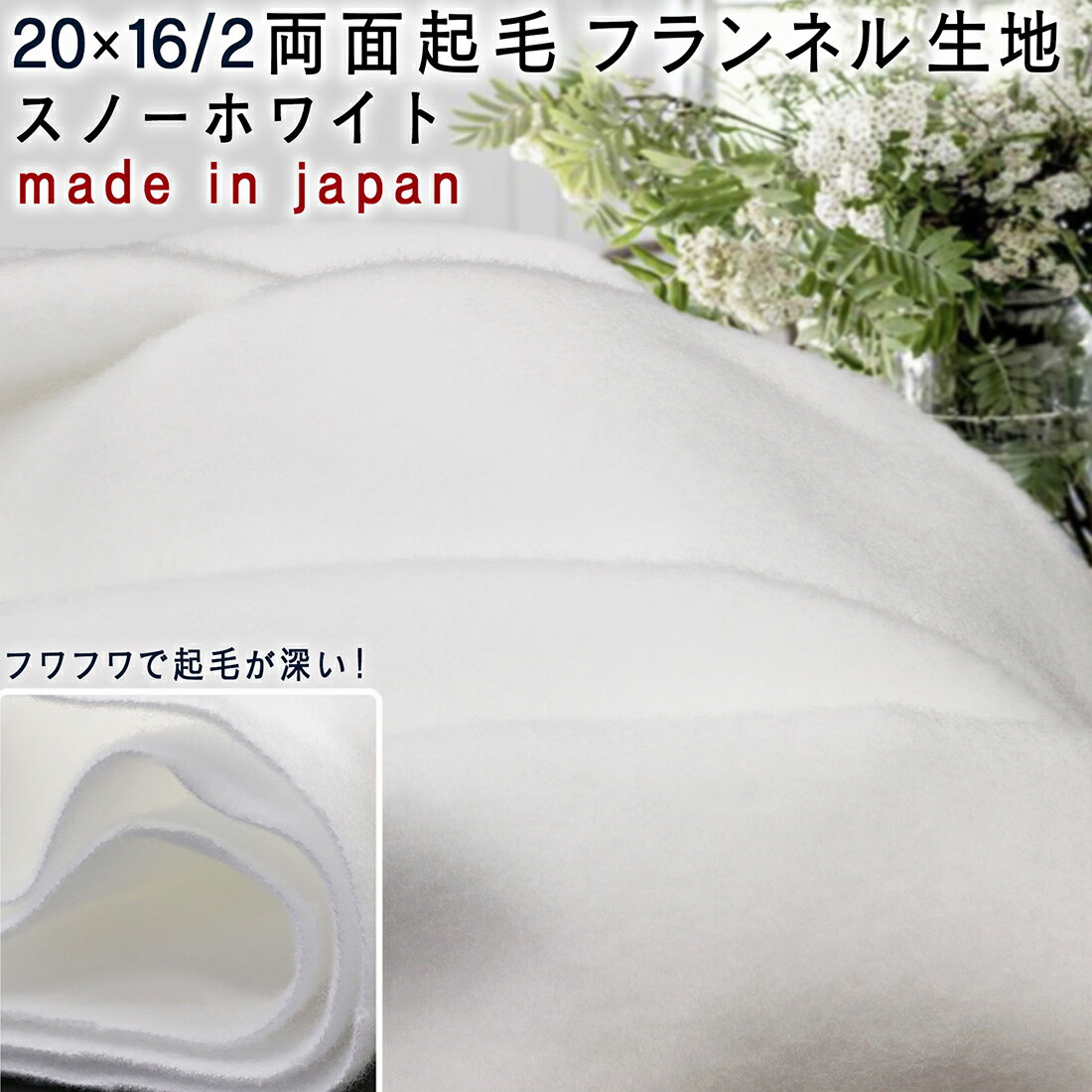20×16/2両面起毛加工フラン ネル生地 スノーホワイト90cm巾10cm単位30cm以上から【1.5mネコポス可】吸水...