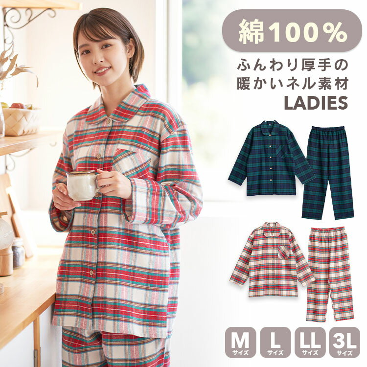 パジャマ レディース 綿100% 長袖 冬 前開き ボタン 厚手のネル起毛 先染め ギンガムチェック柄 S M L ...