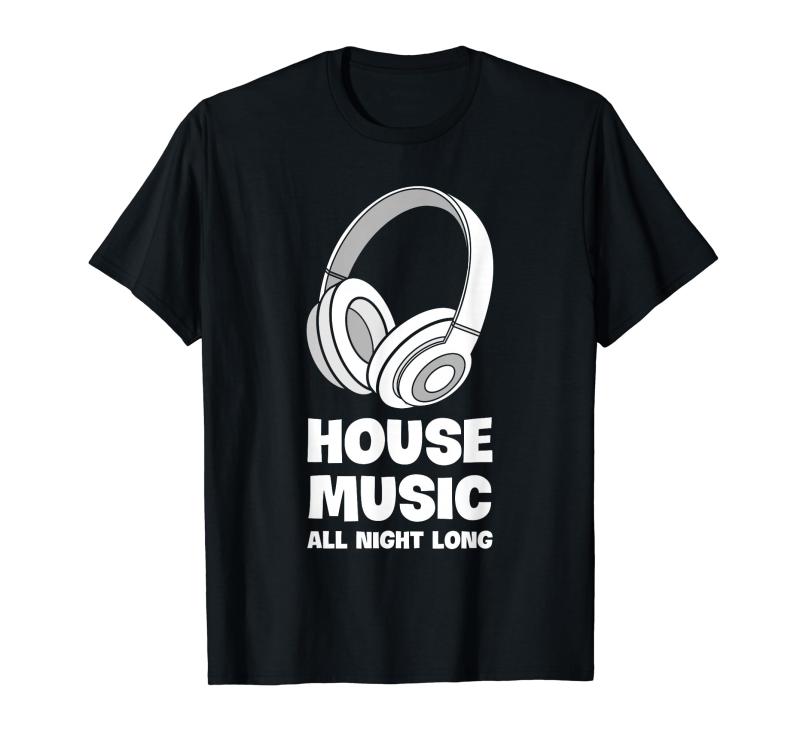 ハウスミュージック オールナイト ロングダンス DJ EDM テクノ Tシャツヘッドフォンのイメージと「house music all night long」という引用句が書かれたハウスミュージックデザイン。男性、女性、子供、またはシ...