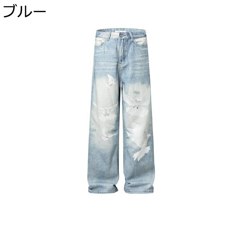 デニムパンツ メンズ レディース ハト プリント ストレートパンツ 個性 ファッション ヴィンテージ スト...