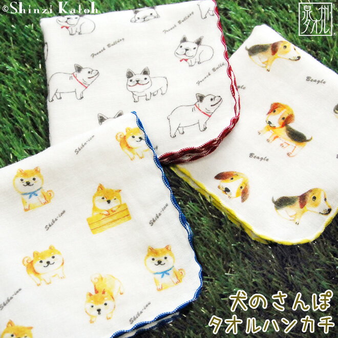 【Shinzi Katoh】『犬のさんぽ』タオルハンカチ 約23×23cm ガーゼ 無撚糸 犬グッズ 雑貨 シンジカトウ ...