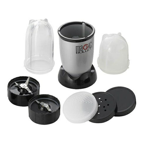 <マジックブレットデラックス> セット内容本体x1、フラットブレードx1、クロスブレードx1、カップ大x1、カップ小x1、電子レンジ用カップx1、保存用キャップx2、穴あきキャップx1、電子レンジ用穴あきキャップ(...