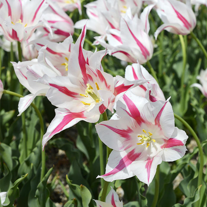 映画スターの名を持つ花マリリン庭をステージに変える。春の花壇でひときわ目立つ!赤白ストライプが美しい、珍しいユリ咲きチューリップ。