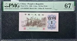 PMG67 EPQ "1962 CHINA RMB 1 Jiao BankNote (+FREE1 note) #33385