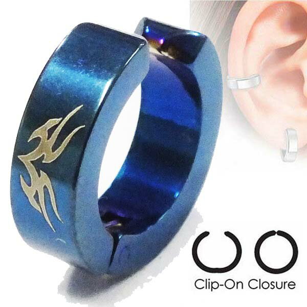 青色の色鮮やかなサージカルステンレス316L製のイヤリングにトライバルタトゥをデザインしたペアルックに最適のノンホールピアス。 ワンタッチで装着でき、フープピアスをしているようにしか見えない穴を開けない...
