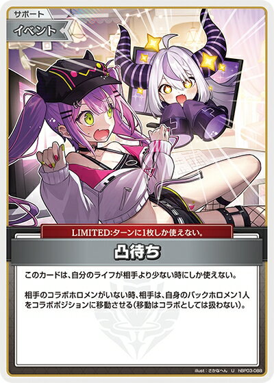 ★hololive OFFICIAL CARD GAME「エリートスパーク」(hBP03)収録 ●hBP03-088 ●カード名:凸待ち ●カテゴリー:サポート・イベント・LIMITED ●HP:180 ●レアリティ:U(アンコモン)★当店のシングルカードはデッキ,パ...