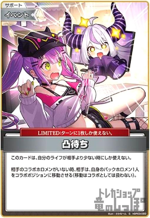 ★hololive OFFICIAL CARD GAME「エリートスパーク」(hBP03)収録 ●hBP03-088 ●カード名:凸待ち ●カテゴリー:サポート・イベント・LIMITED ●レアリティ:S(スペシャル)★当店のシングルカードはデッキ,パック開封...