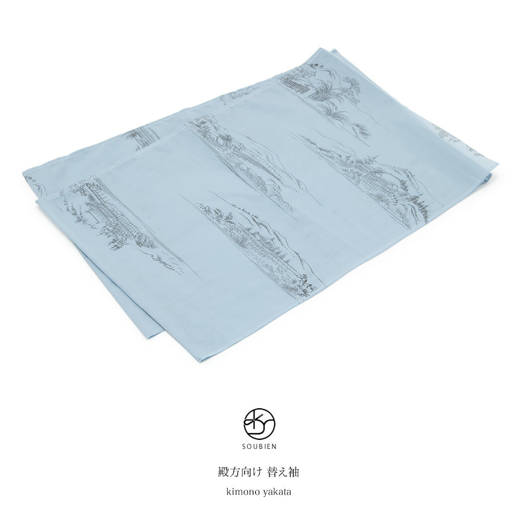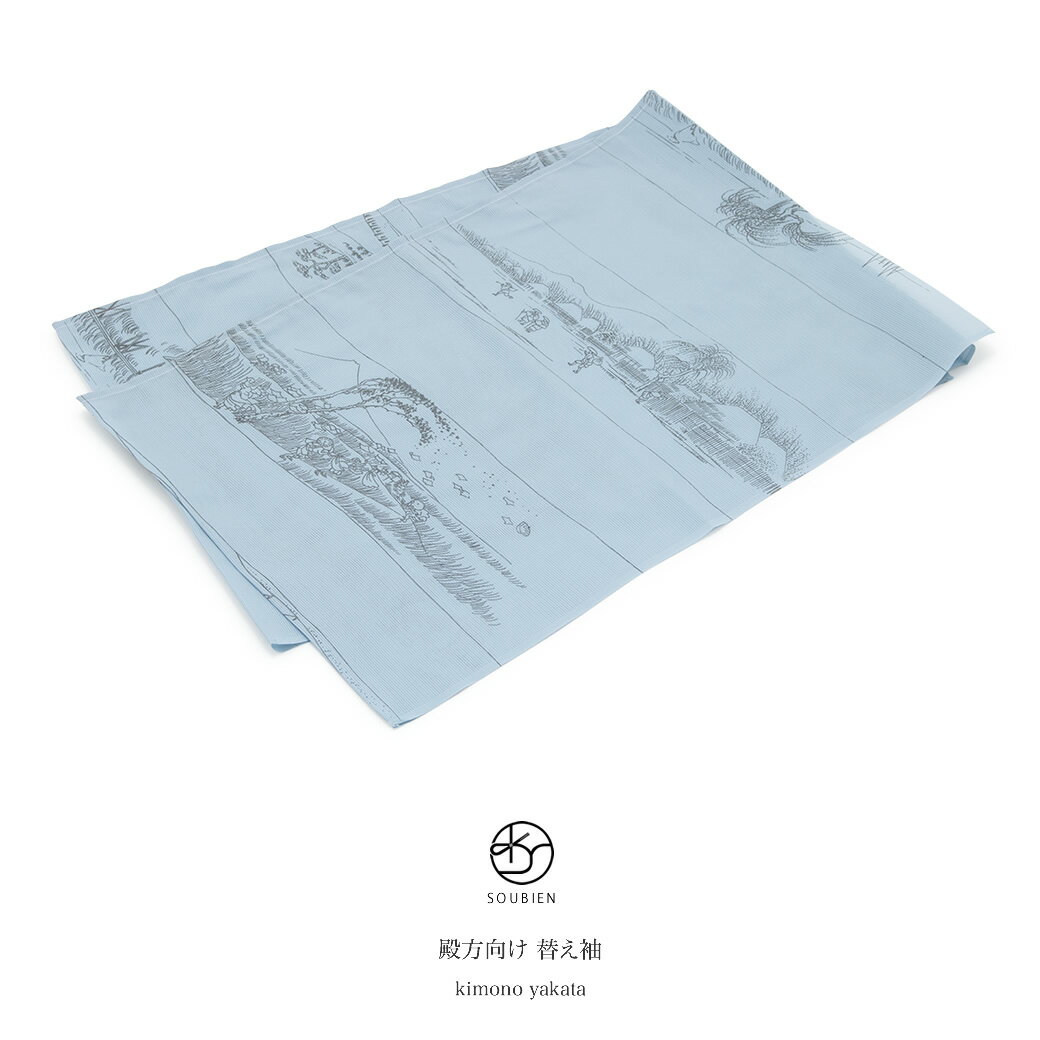 【さりげなく袖元を彩るメンズ替袖】水色/ライトブルー/名所旧跡文/川からの風景/絽/夏向き/おそでじ/半襦袢/替え袖/かえそで/和装小物