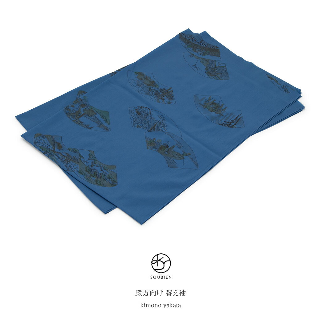 【さりげなく袖元を彩るメンズ替袖】青/ブルー/名所旧跡文/大風の畑/旅の風景/おそでじ/半襦袢/替え袖/かえそで/和装小物