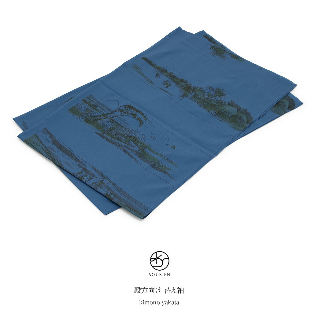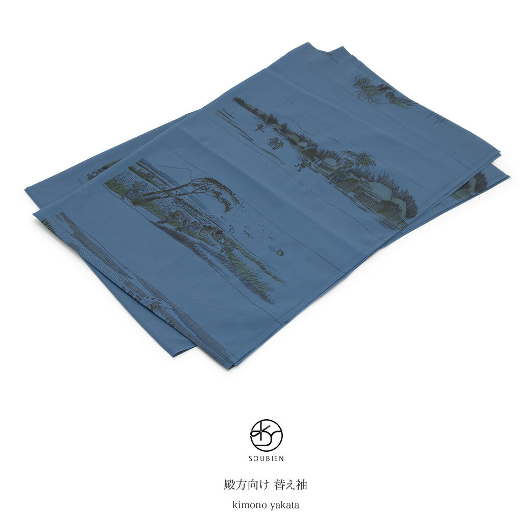 【さりげなく袖元を彩るメンズ替袖】青系/ブルー/名所旧跡文/大風の畑/旅の風景/おそでじ/半襦袢/替え袖/かえそで/和装小物