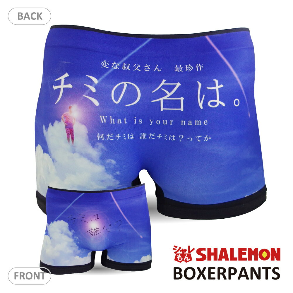 人気映画と変なおじさん を合体パロディした面白いボクサーパンツです。 君の名は。のオフィシャル品ですか?という変なおじさん的質問はしないでください(笑)。見ての通り100%パロディです。 前と後ろの両面フ...