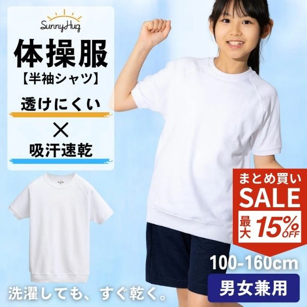学校標準 男女児兼用 体操服 半袖 白 体操着 サニーハグ 男の子 女の子 幼稚園 小学生 中学生 体育 運動服 丸首 学校 男児 女児 子供 こども 小学校