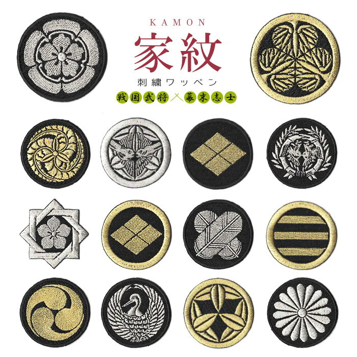 MEMO 戦国武将や幕末志士の家紋をモチーフにした刺繍ワッペン。 黒地に金や銀の糸で刺繍を施したシンプルながらもしっかりとした存在感が◎ あなたの家の家紋をつけるのはもちろん、好きな戦国武将や幕末志士など...