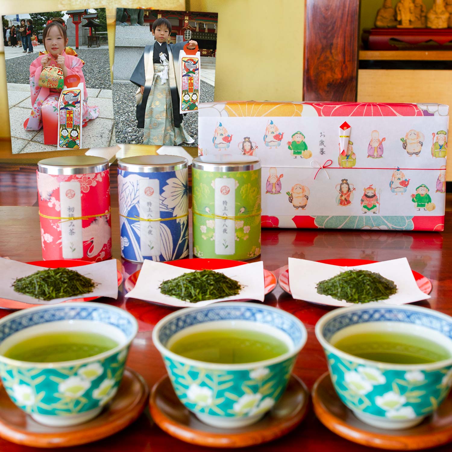 [手提げ袋付・写真名入れOK] 創業80年 お茶 ギフト 3缶 (初摘100g/特八100g/八八100g) お歳暮 お年賀 七...