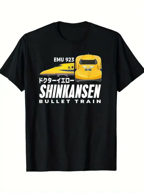 200gのコットン製Tシャツ。ブラックのTシャツにイエローの新幹線グラフィックを配し、日本語と英語で「...