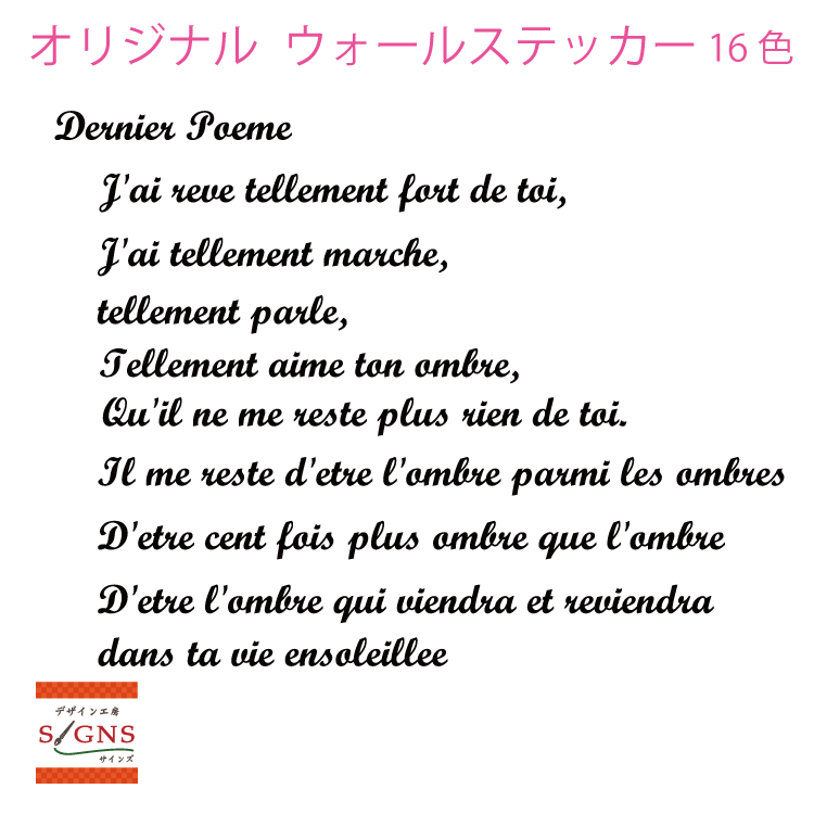 ステッカーの大きさ(レイアウト例 ) 全体巾 約 100cm 各行 高さ約3〜4cm 「最後の歌(Dernier Poeme)」:ロベーヌ・デスノス デザイン工房サインズ オリジナル商品です! お買い得価格にて、製作&販...