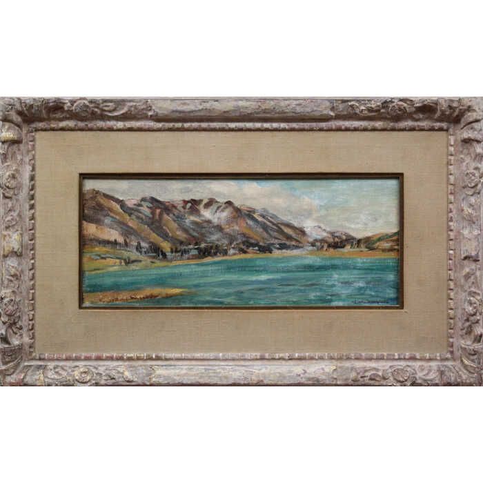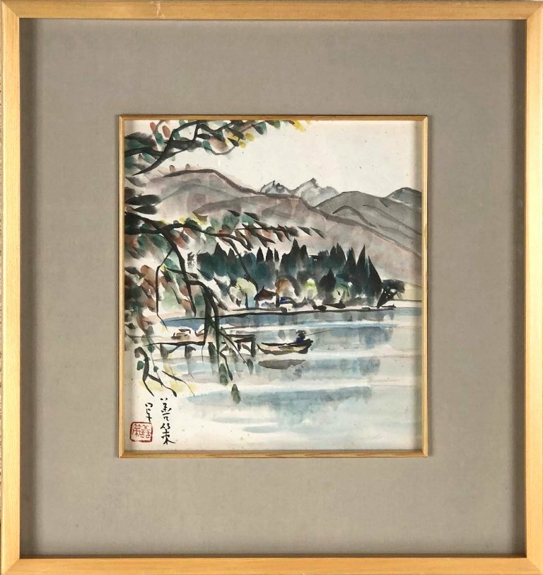 自然豊かな湖の風景裏書は旧画号である「松島正人」画寸:変型8号(19cm×45.5cm)額縁はヴィンテージ額(ガラス、裏板なし)木崎湖は長野県にある仁科三湖のうちのひとつ。映画「白線流し」「男はつらいよ 寅次郎...