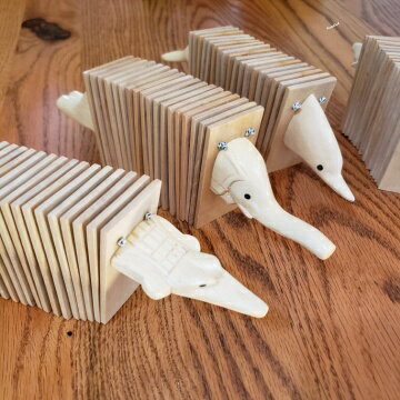 アニマル(顔としっぽ)を持って左右に動かすと18枚の板が重なり合ってカチャカチャと軽快な音を出します 両方から打ち合わせて鳴らす楽器です 【材質】木製 【サイズ】(cm)1番出ている場所からの計測 長さ26×横...