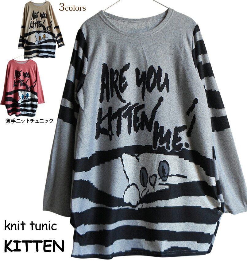 送料無料 チュニック ワンピース 長袖 薄手 ニットワンピース 猫 ねこ ネコ のぞき猫 ひょこり グレ ー...